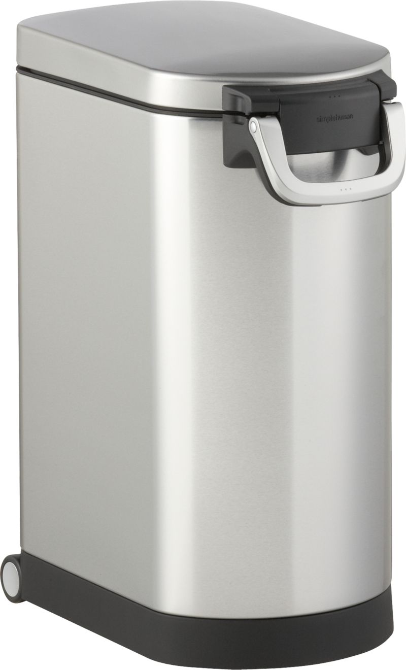 Only available online ship this item schedule your delivery date at checkout this item is only available for shipping. Perfect for managing large, heavy bags of dry pet food, this simplehuman stainless steel pet food storage can keeps food in and pets out. The can includes a convenient scoop that attaches neatly under the lid. Round step can is right at home in the kitchen bath, office or even in the closet for dry cleaning slips and garment tags. A silicone gasket forms an airtight seal so food stays fresh.